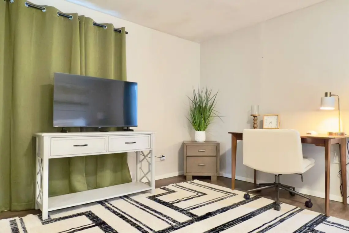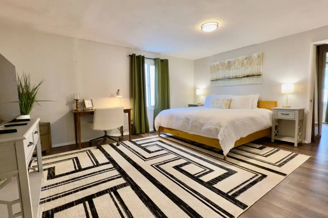 Primary Bedroom: Features a spacious and comfortable king-sized bed and a dedicated workspace.